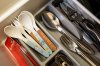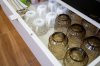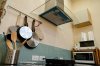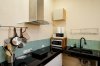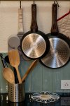 The kitchen area is fully equipped with a rice cooker, frying pan, pots, and dishes for convenient cooking.